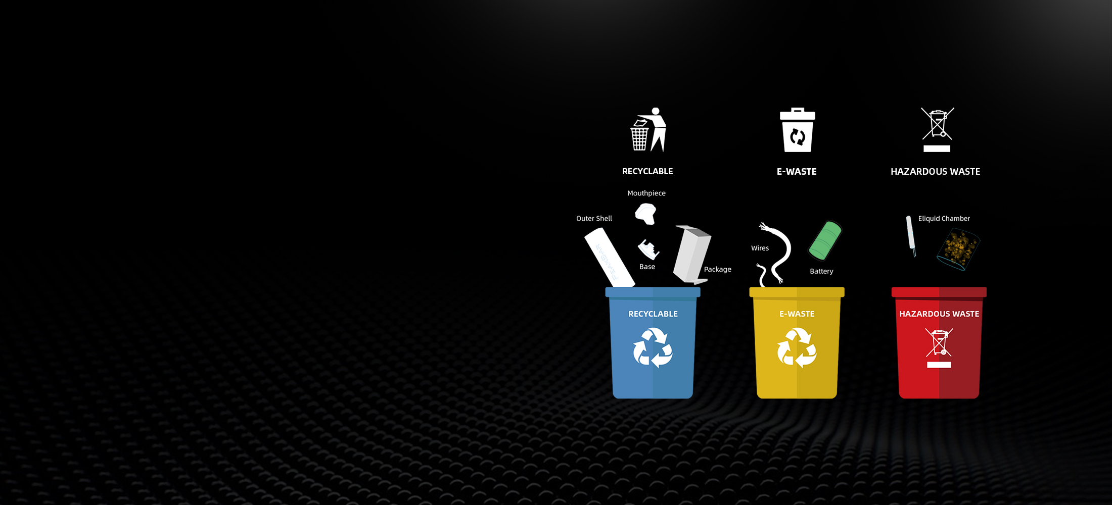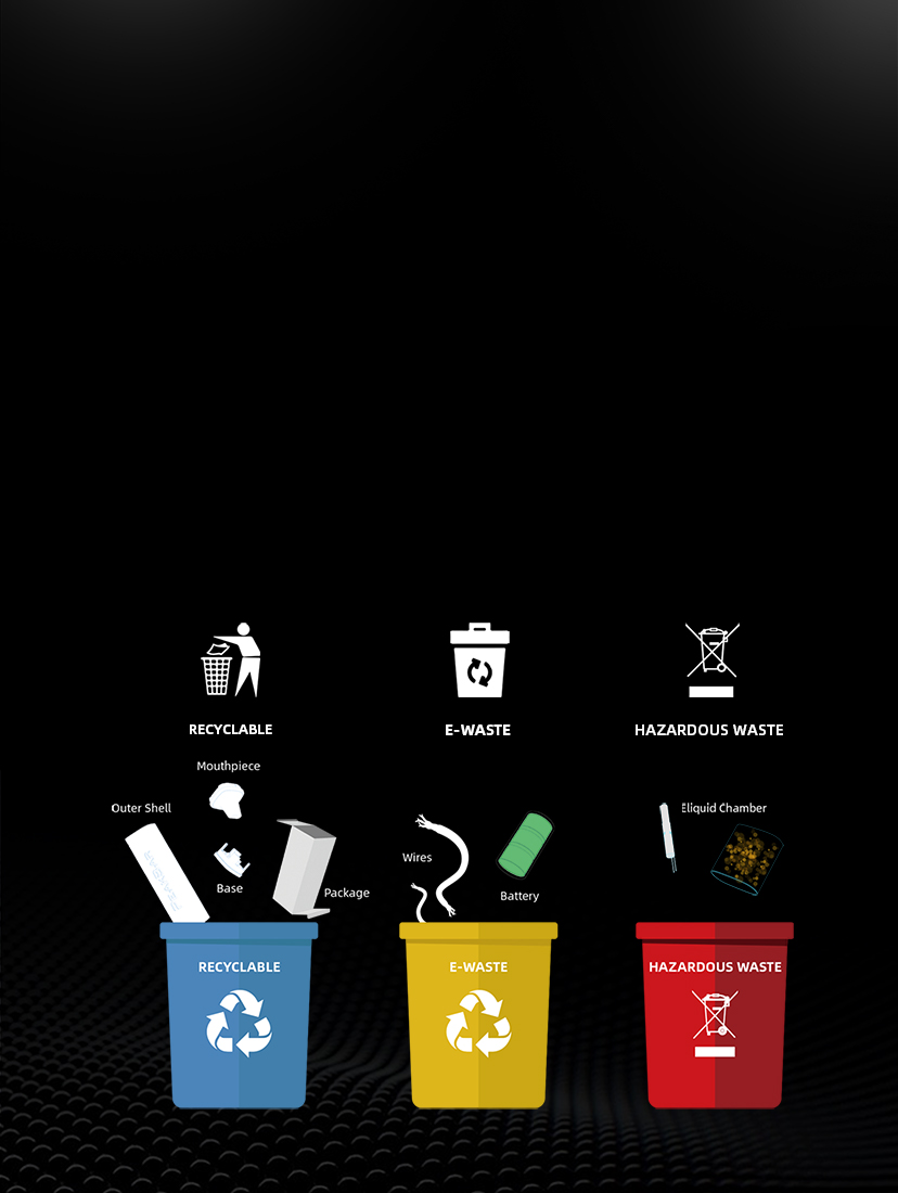 To reduce disposable waste and protect our living environment, GOPRIME devices are always designed to be readily disassembled into four parts, including battery & wire, mouthpiece & base, outer shell, and E-liquid chamber, which allows for easy recycling.